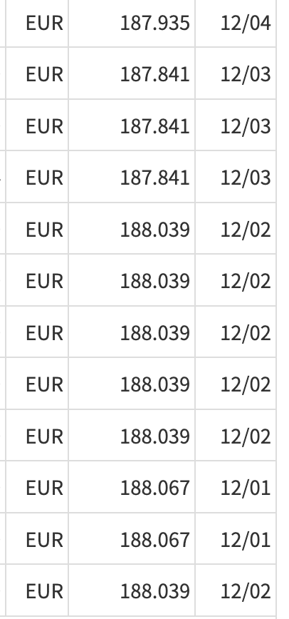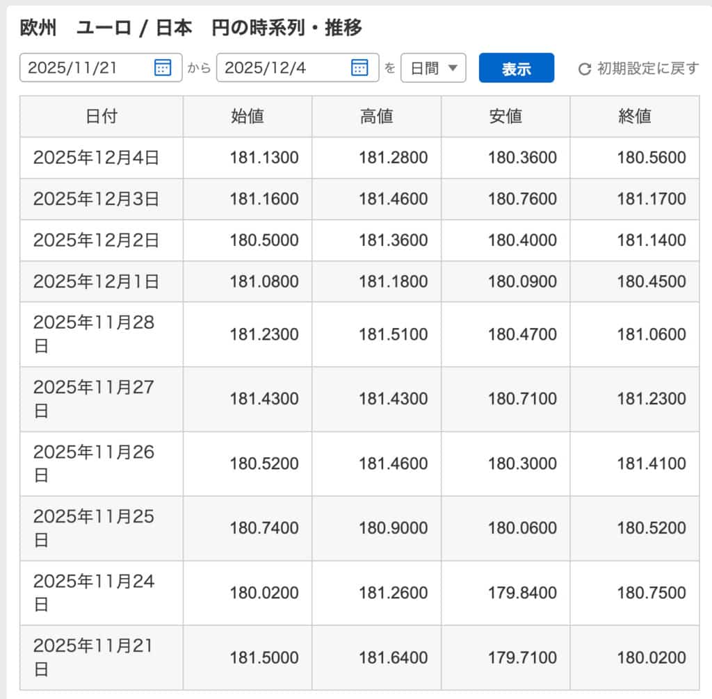 まず参考までに11/21〜12/4のEUR/円のレートを調べてみました。もっとも安値でも179.71円、高値では181.46円で2円弱の開きがあったようですね。でもだいたい180円後半から181円前半という感じ。