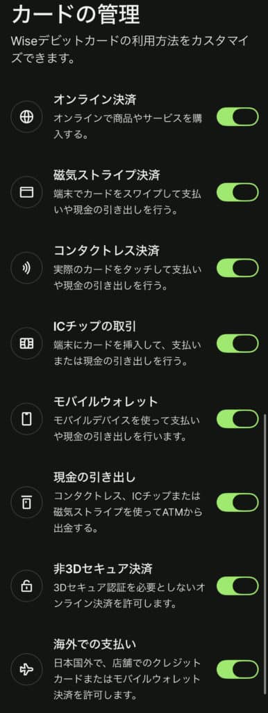 オンライン決済についてはデビットカードを使わずとも、アプリ内で発行する別の番号を(デジタルカード)が3枚まで使えるので、それを使うならデビットカードのオンライン決済機能はオフっておいてフィジカル専用にするのもいいですよね。