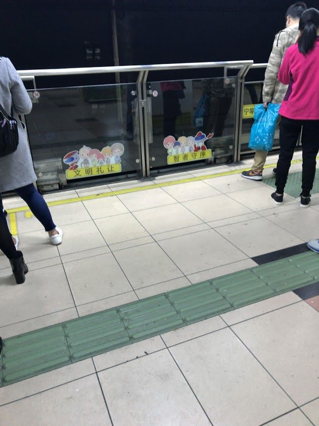 あと「上海のラッシュ時の電車マナーが悪かった!」という話も聞きました。2年前に行ったという人は「入る人と出る人が同時にぶつかり合うガチンコ空間」とのこと。ちょっと恐れていましたが、朝のけっこうなラッシュなのに、みなさんきちんとしてましたよ(というか日本に比べるとそこまでは混んでなかったんですが)! 駅のガードにはこんなシールが貼ってあります。「智者守序」うーん。見ただけでなんか意味わかる。